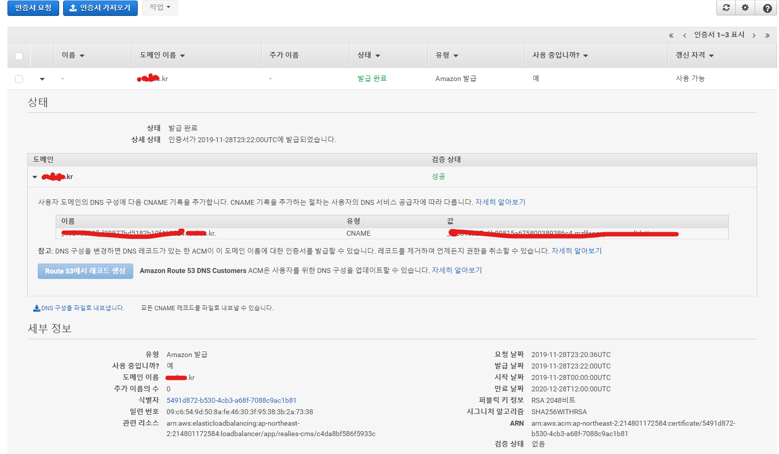 - DNS 인증을 예시로 하면 "Route53에서 레코드 생성" 버튼을 누르고 잠시 후에 검토 과정이 성공으로 바뀌면 정상적으로 발급이 된 것이다.