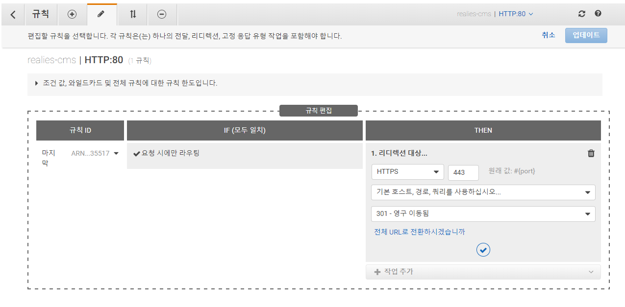 위 ALB 설정시 추가했던 리스너가 표로 있을 것이다. 여기서 80포트의 규칙 부분의 규칙 보기/편집 버튼을 눌러 설정해줄 수 있다.