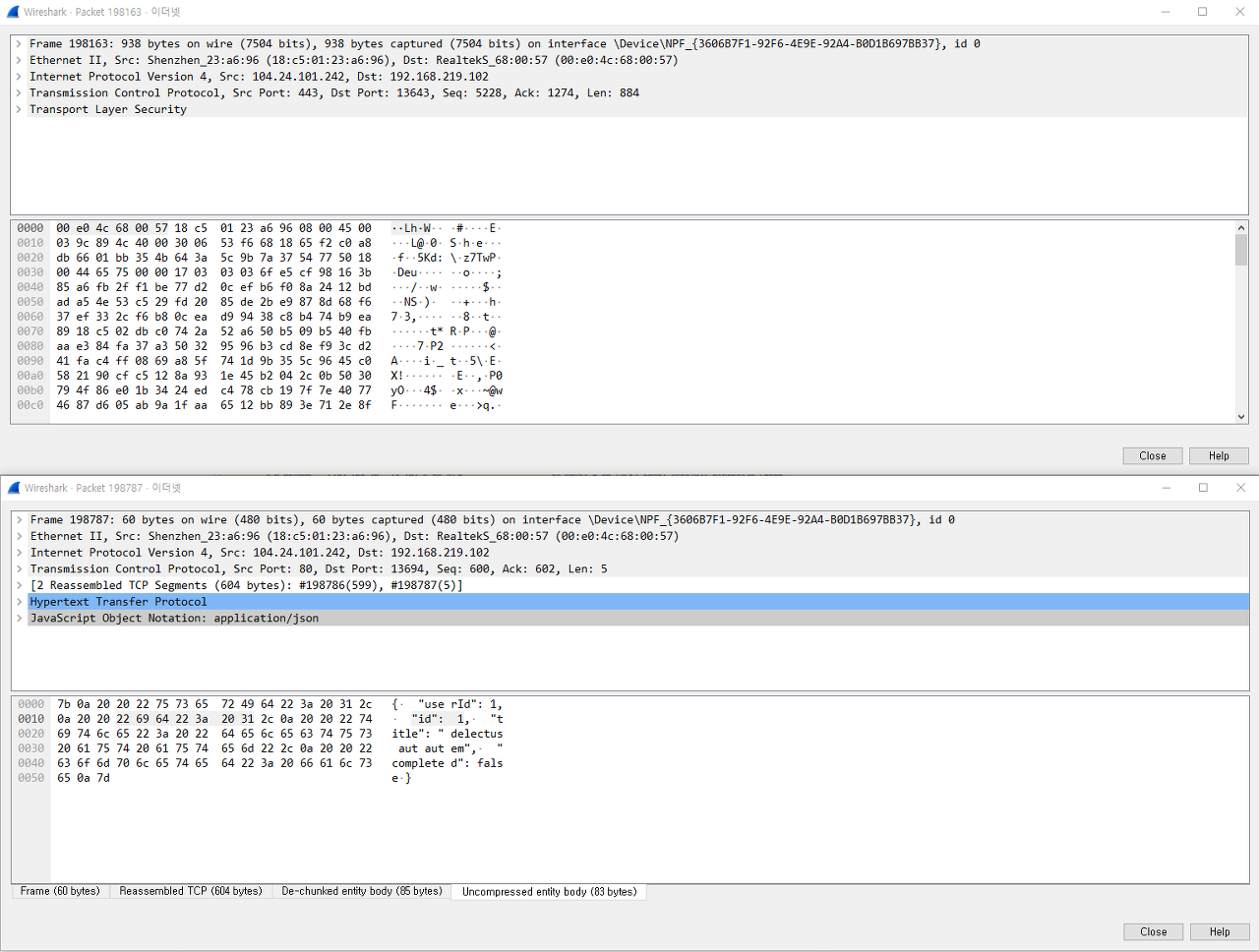 - 위가 HTTPS 패킷(198163), 아래가 HTTP 패킷(198787)