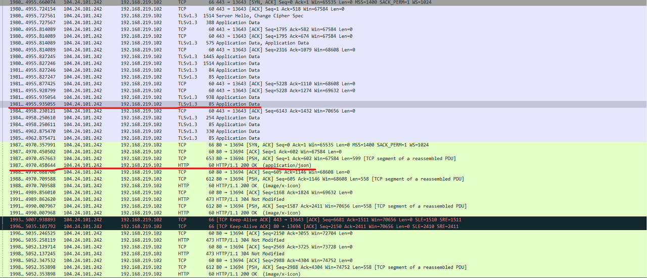 - 보라색 부분이 HTTPS 통신 패킷, 연두색 부분이 HTTP 통신 패킷