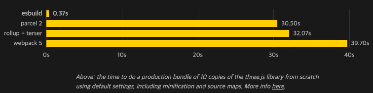 - webpack에서 esbuild loader 형태로 사용한다면 transpile, minify 절차만 esbuild에 위임하고 있다고 보면 된다. 이것만으로도 드라마틱한 빌드 시간 절약을 확인할 수 있다.